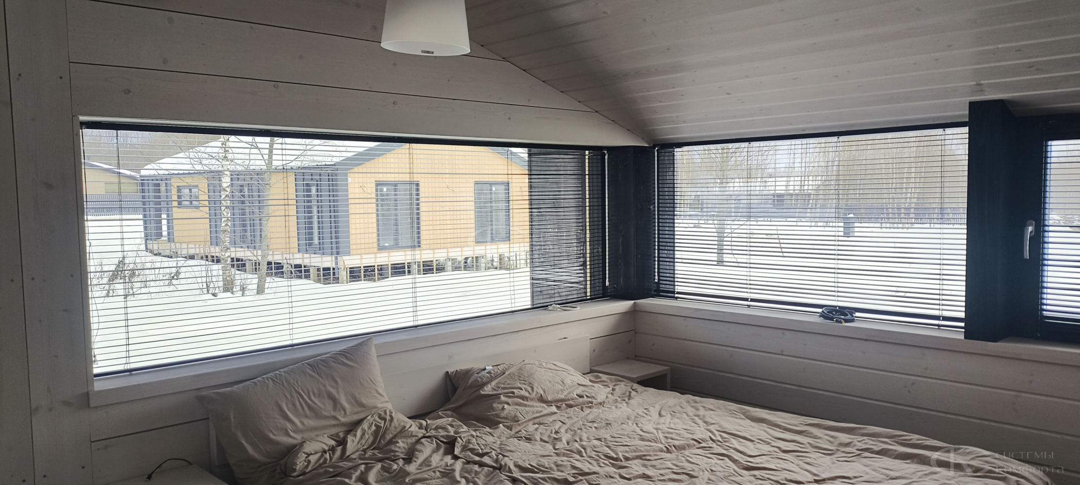 Жалюзи можно собрать полностью или оставить опущенными, но повернуть планки параллельно подоконнику — так свет будет беспрепятственно проникать в помещение.